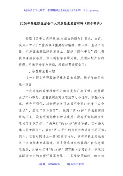 / 2024年度组织生活会个人对照检查发言材料(四个带头)