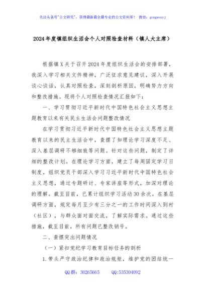 / 2024年度镇组织生活会个人对照检查材料(镇人大主席)