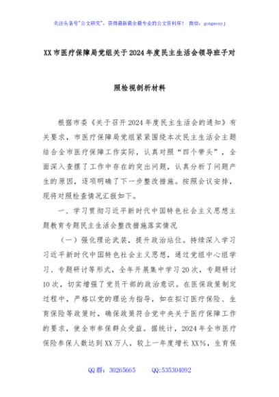 / XX市医疗保障局党组关于2024年度民主生活会领导班子对照检视剖析材料