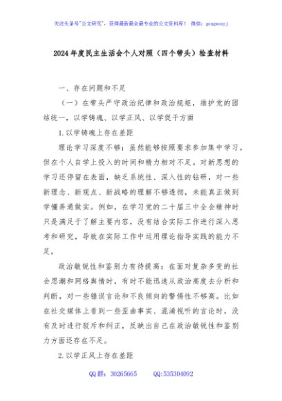 / 2024年度民主生活会个人对照(四个带头)检查材料