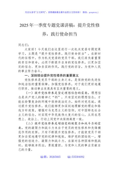 / 2025一季度党课讲稿:提升党性修养,践行使命担当