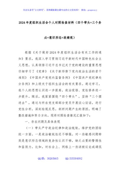 2024年度组织生活会个人对照检查材料(四个带头+三个务必+意识形态+政绩观)
