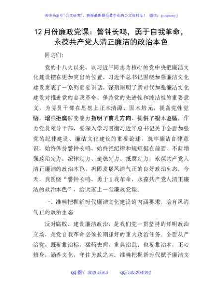 / 12月份廉政党课:警钟长鸣,勇于自我革命,永葆共产党人清正廉洁的政治本色