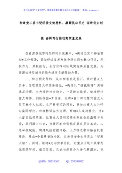 / 街道党工委书记经验交流材料:凝聚民心民力 深耕创安创稳 奋楫笃行推动高质量发展