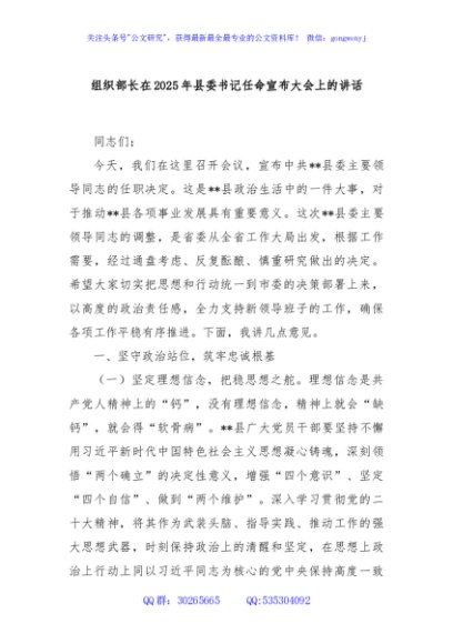 / 组织部长在2025年县委书记任命宣布大会上的讲话