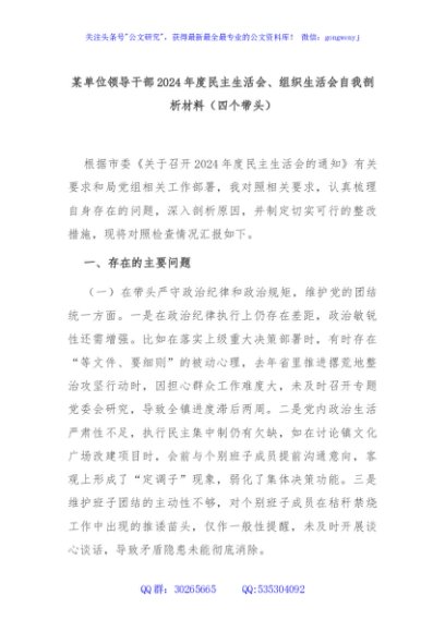 / 某单位领导干部2024年度民主生活会、组织生活会自我剖析材料(四个带头)
