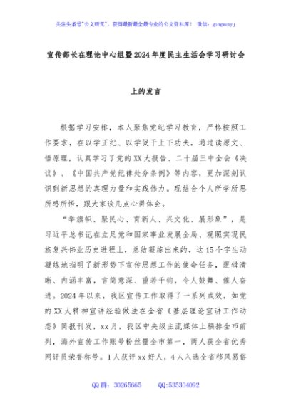 / 宣传部长在理论中心组暨2024年度民主生活会学习研讨会上的发言