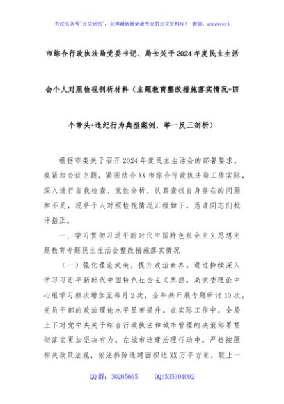 市综合行政执法局党委书记、局长关于2024年度民主生活会个人对照检视剖析材料(主题教育整改措施落实情况+四个带头+违纪行为典型案例,举一反三剖析)