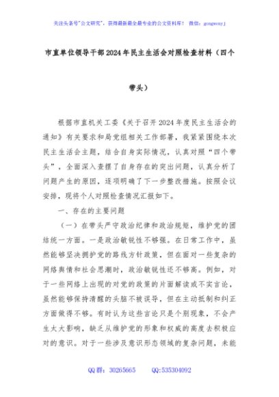 / 市直单位领导干部2024年民主生活会对照检查材料(四个带头)