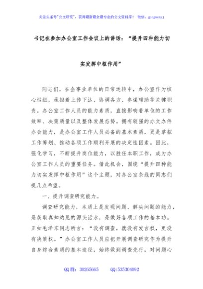 / 书记在参加办公室工作会议上的讲话:“提升四种能力切实发挥中枢作用”