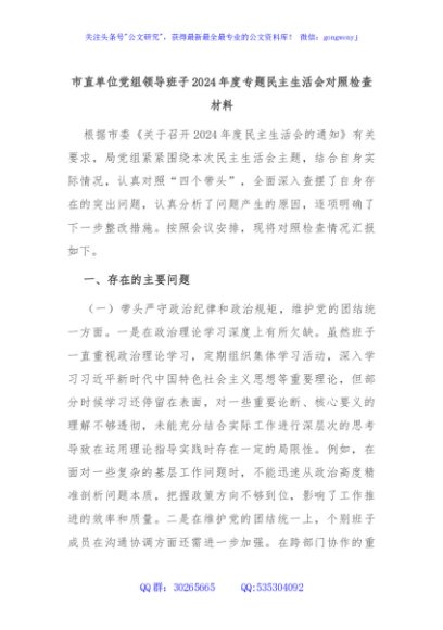 / 市直单位党组领导班子2024年度专题民主生活会对照检查材料