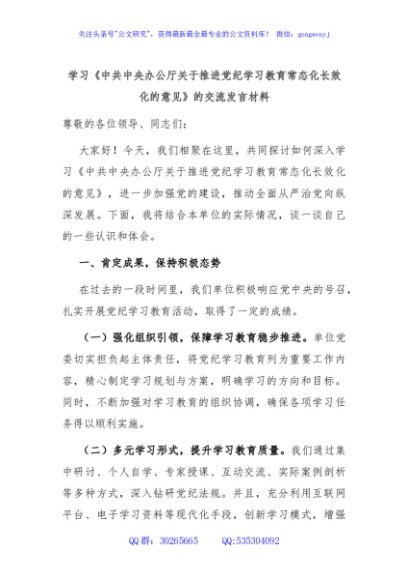 / 学习《中共中央办公厅关于推进党纪学习教育常态化长效化的意见》的交流发言材料