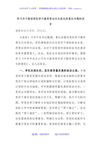 / 学习关于推进党纪学习教育常态化长效化的意见专题的发言