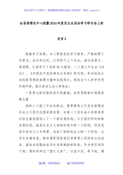 / 在县委理论中心组暨2024年度民主生活会学习研讨会上的发言2
