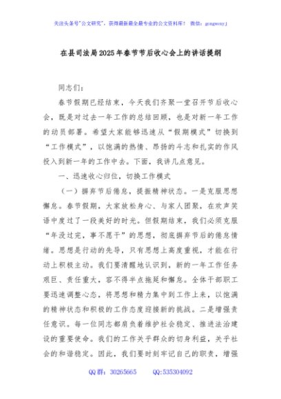 / 在县司法局2025年春节节后收心会上的讲话提纲