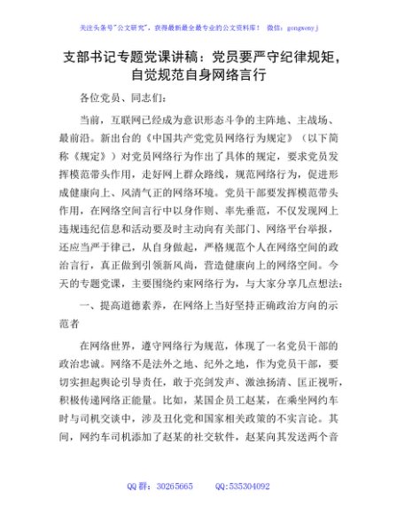 / 支部书记专题党课讲稿:党员要严守纪律规矩,自觉规范自身网络言行