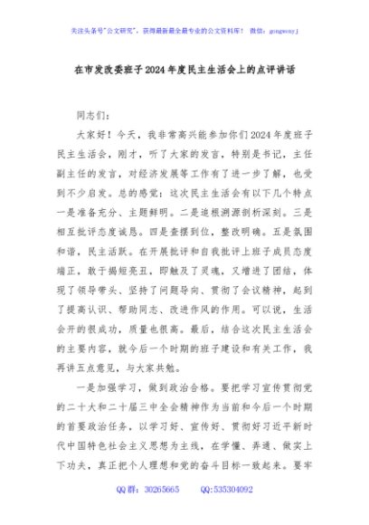 / 在市发改委班子2024年度民主生活会上的点评讲话