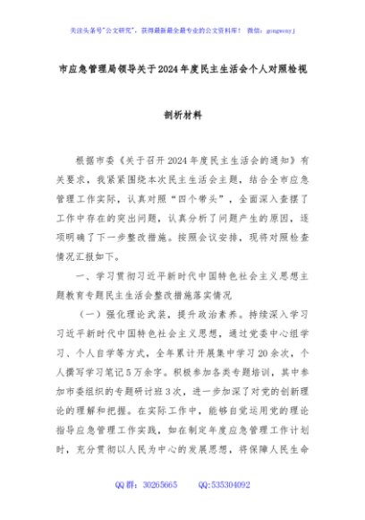 / 市应急管理局领导关于2024年度民主生活会个人对照检视剖析材料