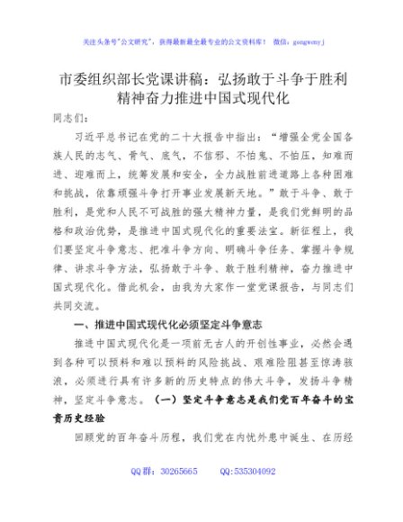 / 市委组织部长党课讲稿:弘扬敢于斗争于胜利精神奋力推进中国式现代化