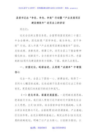 / 县委书记在“争优、争先、争效”行动暨“产业发展项目建设增效年”动员会上的讲话