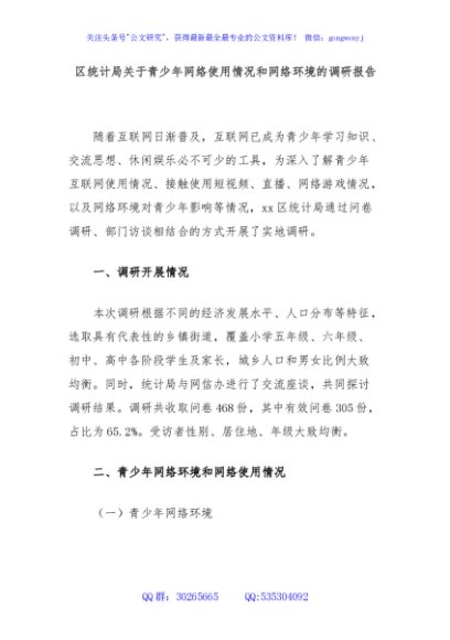 / 区统计局关于青少年网络使用情况和网络环境的调研报告