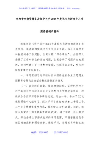/ 市粮食和物资储备局领导关于2024年度民主生活会个人对照检视剖析材料