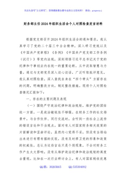 / 财务部主任2024年组织生活会个人对照检查发言材料