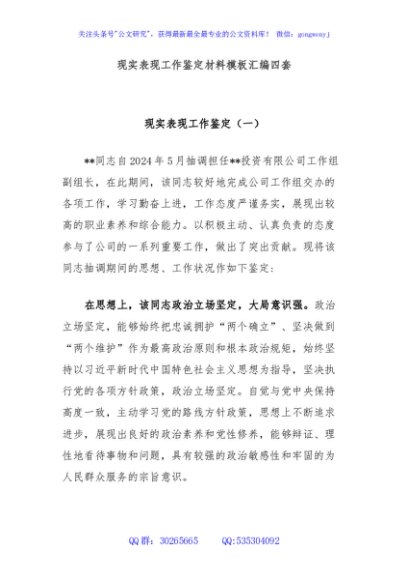 / 现实表现工作鉴定材料模板汇编四套