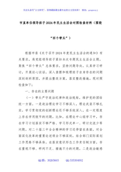 / 市直单位领导班子2024年民主生活会对照检查材料(围绕“四个带头”)