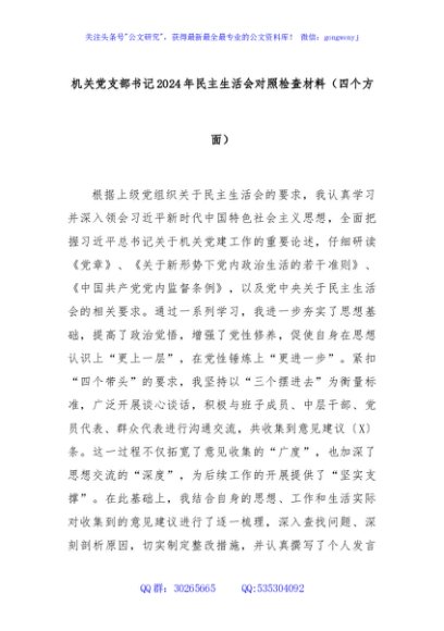 / 机关党支部书记2024年民主生活会对照检查材料(四个方面)