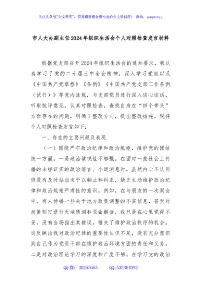 / 市人大办副主任2024年组织生活会个人对照检查发言材料