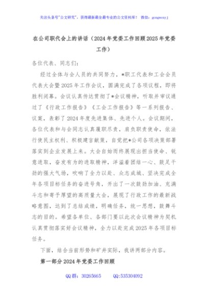/ 在公司职代会上的讲话(2024年党委工作回顾2025年党委工作)
