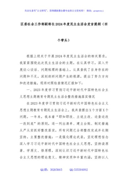 / 区委社会工作部副部长2024年度民主生活会发言提纲(四个带头)