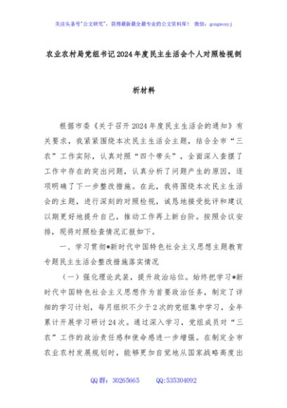 / 农业农村局党组书记2024年度民主生活会个人对照检视剖析材料