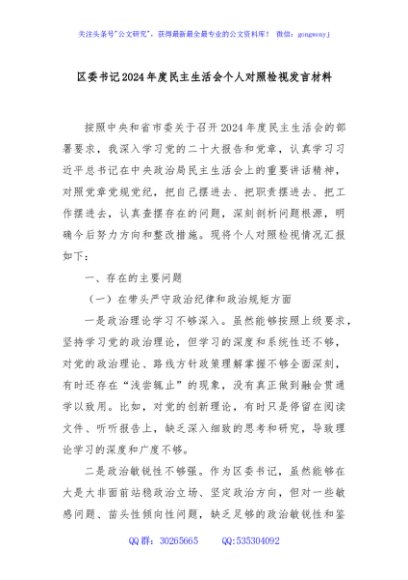 / 区委书记2024年度民主生活会个人对照检视发言材料