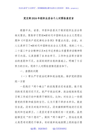 / 党支部2024年组织生活会个人对照检查发言