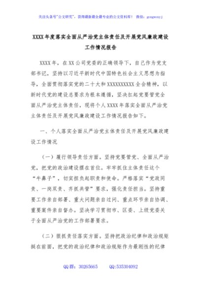 XXXX年度落实全面从严治党主体责任及开展党风廉政建设工作情况报告