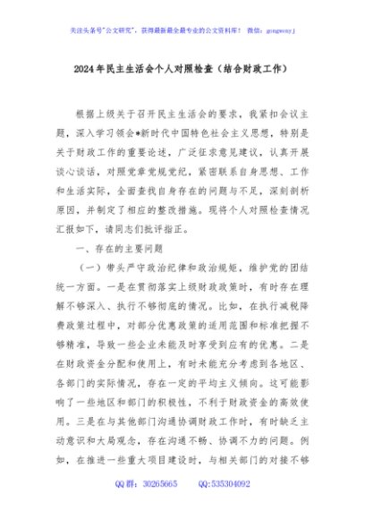 / 2024年民主生活会个人对照检查(结合财政工作)