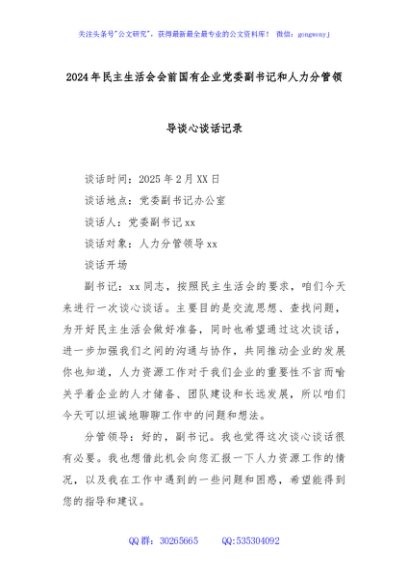 / 2024年民主生活会会前国有企业党委副书记和人力分管领导谈心谈话记录