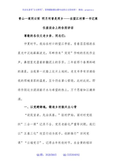 / 青山一道同云雨 明月何曾是两乡——在望江村第一书记离任座谈会上的告别讲话
