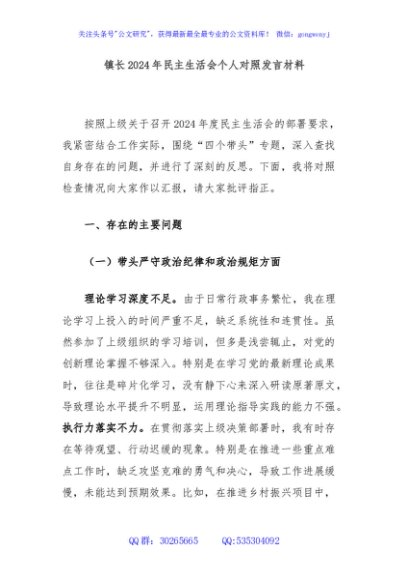 / 镇长2024年民主生活会个人对照发言材料