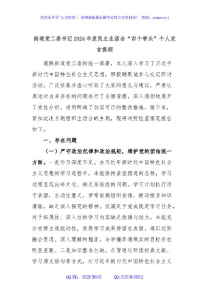 / 街道党工委书记2024年度民主生活会“四个带头”个人发言提纲