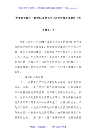 / 市直单位领导干部2024年度民主生活会对照检查材料(四个带头)2