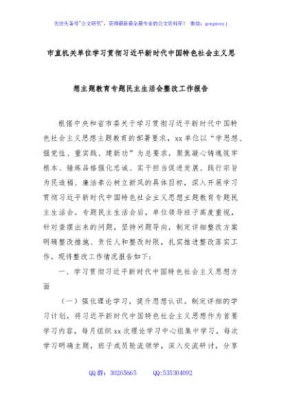 / 市直机关单位学习贯彻总书记新时代中国特色社会主义思想主题教育专题民主生活会整改工作报告