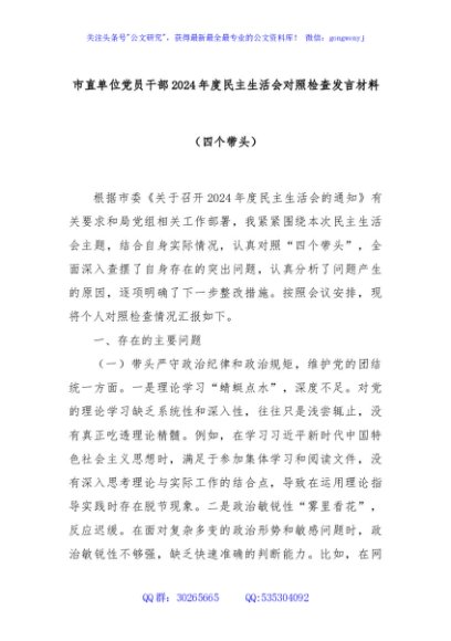/ 市直单位党员干部2024年度民主生活会对照检查发言材料(四个带头)