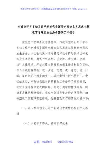 / 市政协学习贯彻习近平新时代中国特色社会主义思想主题教育专题民主生活会整改工作报告