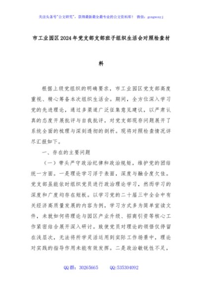 / 市工业园区2024年党支部支部班子组织生活会对照检查材料