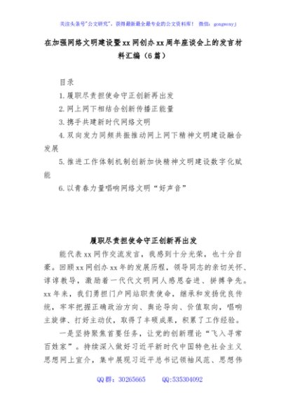 / (6篇)在加强网络文明建设暨xx网创办周年座谈会上的发言材料汇编