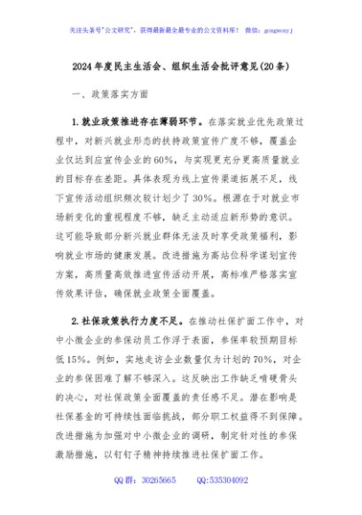 / (20条)2024年度民主生活会、组织生活会批评意见