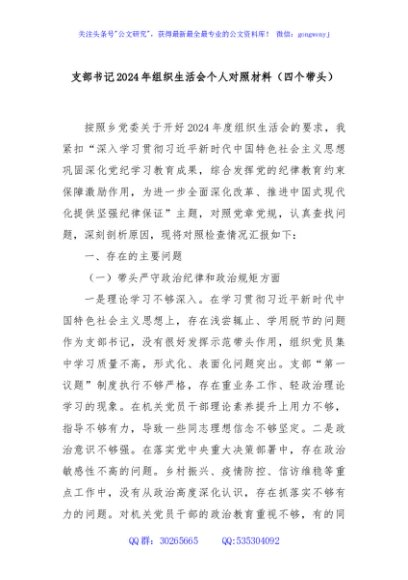 / 支部书记2024年组织生活会个人对照材料(四个带头)